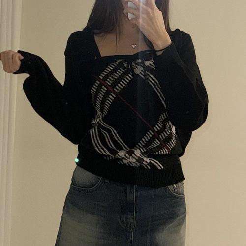 [옷자락]여자 투피스 리본 체크 탑나시 볼레로 가디건 세트