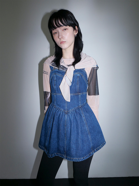 [엘런아크] 하트넥 슬리브리스 데님 탑_다크블루