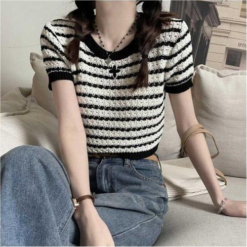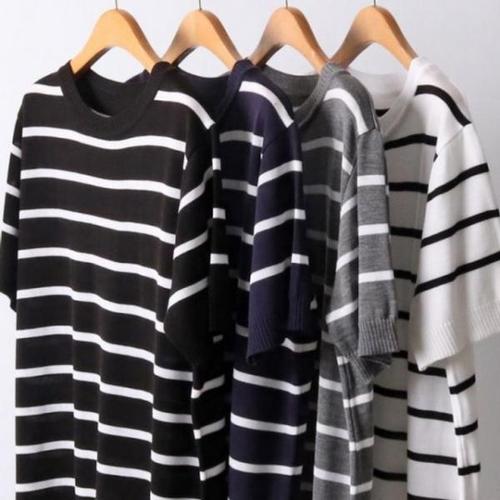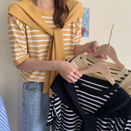 [오너클랜]인기상품 스트라이프 라운드넥 니트 페이크 숄 반팔 티셔츠 [WF05E7D_250918]