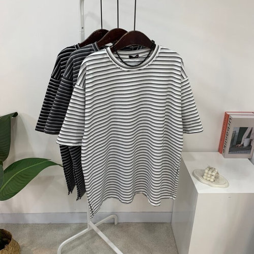 고품질 정장 루즈 솔리드 단가라 스트라이프 반팔 오버핏 (WFJREQ7)