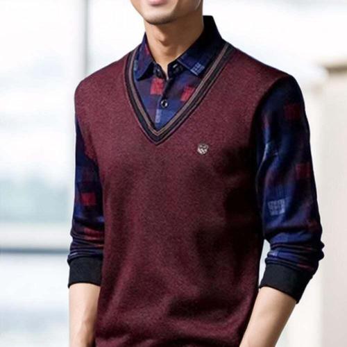 봄 가을 남성 레이어드 셔츠 캐주얼 페이크 투피스 셔츠넥 긴팔 니트 패션 남자 니트티 긴소매 상의 YJW