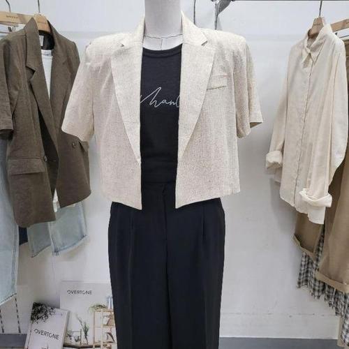 [오버톤]DP01 어깨패드 반팔 린넨 크롭 재킷 OBJF522