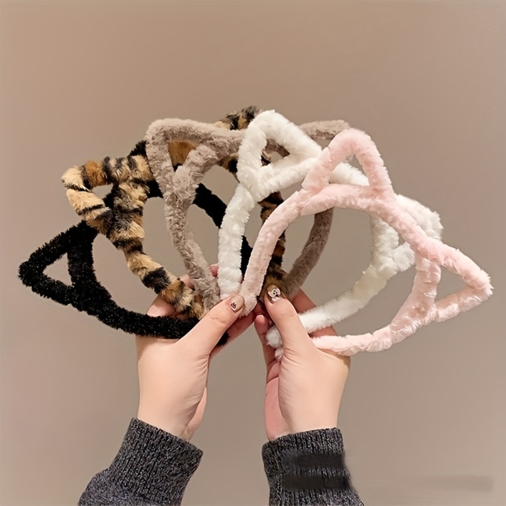 TEMU 프린트 플러시 고양이 귀 머리띠 5개 세트, 귀여운 빈티지 스타일 여성용 헤어 액세서리, 메이크업, 세안, 야외 활동에 적합