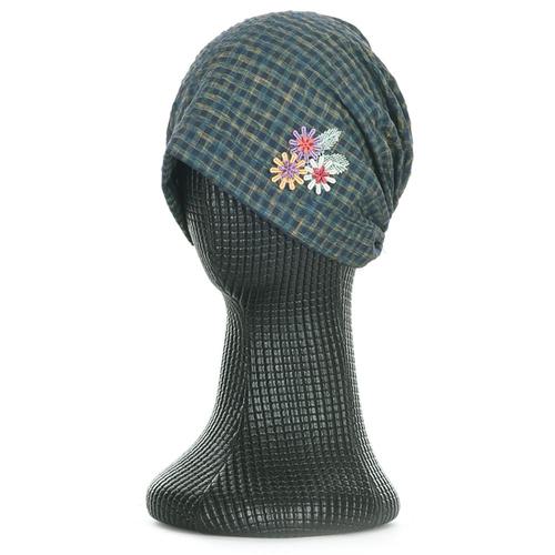 국산 여성 체크 꽃자수 뒷밴딩 비니 두건 보넷 모자 KM-WH-0813-네이비