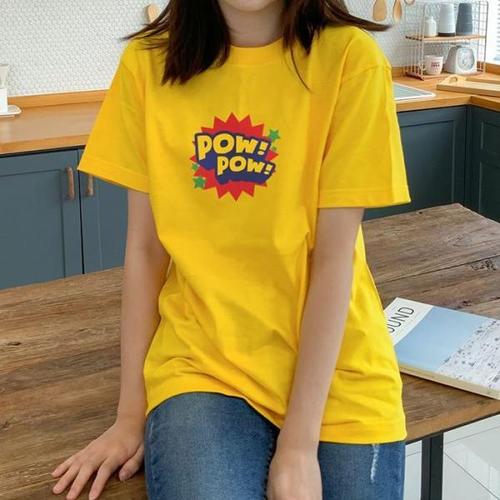 |CST9416|여성 키치 스타일 노란색 반팔 티셔츠 빅사이즈 프린트 힙커버 티