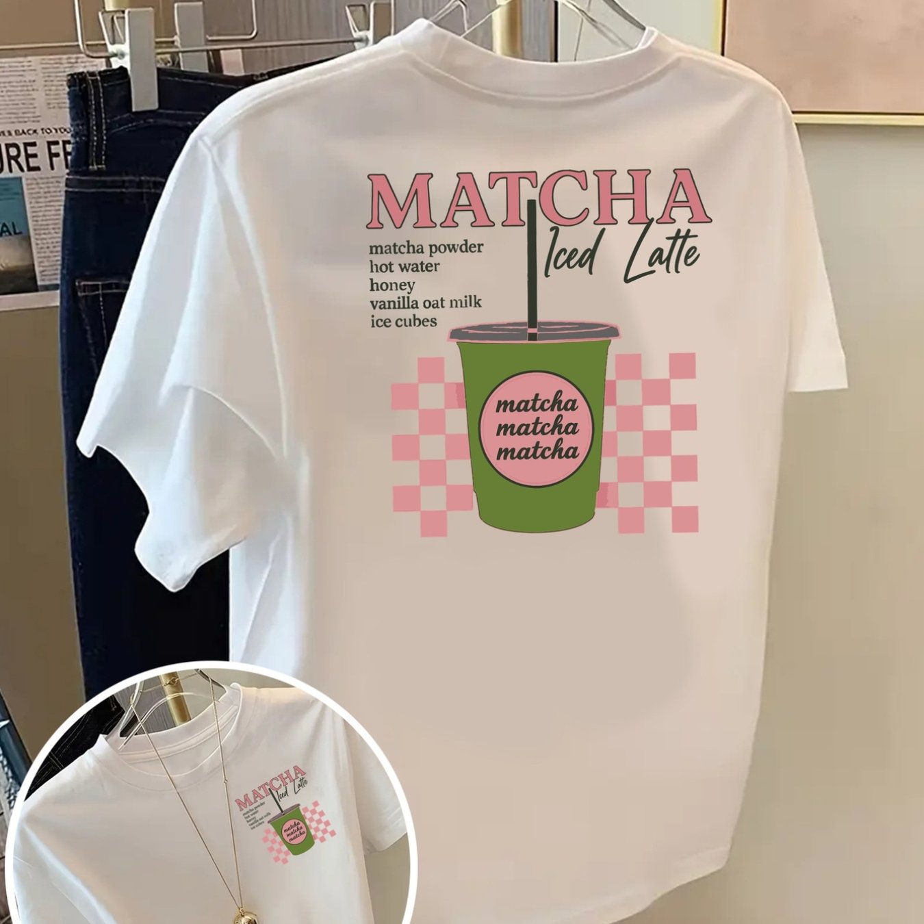 TEMU 앞면과 뒷면에 마초 라떼 프린트가 있는 여성용 티셔츠, 유니크한 양면 디자인의 스타일리시한 반팔, 데일리룩에 완벽 - 편안하고 핏되는 캐주얼 라운드넥 티셔츠, 레저 및 휴식에 이상적입니다.