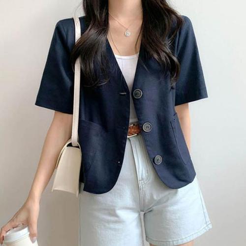 여성 여름 썸머 노카라 브이넥 크롭 반팔 단추 자켓