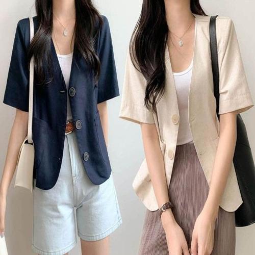 고급스러운 여름 여성 반팔 노카라 브이넥 린넨 재킷