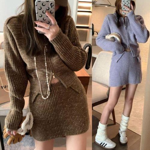 [에이치플러스몰]여성 보카시 집업 니트 스커트 세트 데일리룩 데이트