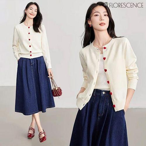 [헬리꽁땡](55~88)2종세트 하트가디건+데님스커트 봄니트 간절기니트 니트티 브이넥 카라넥 봄조끼