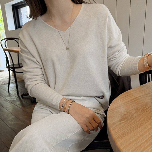 쪼예 [투피스] 여리여리 오프숄더 브이넥 루즈핏 풀오버 니트 나시 세트