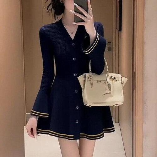 여성 V넥 니트 플레어스커트 일체형 골지 원피스 하객 (HSJ-WDB6812)