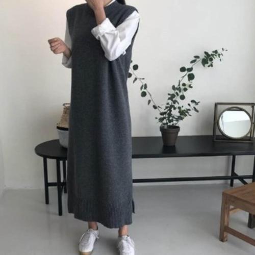 [옷자락]여성 심플 울혼방 레이어드 롱 민소매 니트 원피스