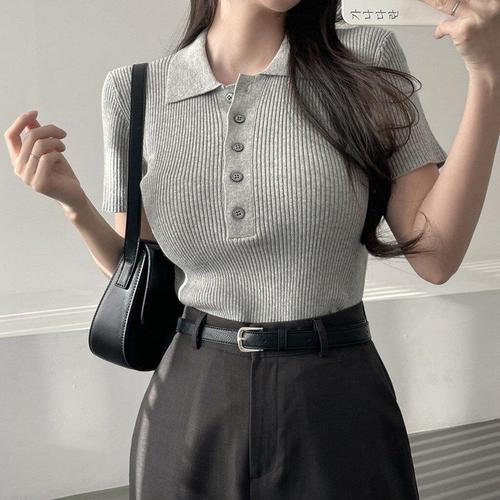 [에이치플러스몰]여성 골지 니트 반팔티 1P 여름 카라티 데일리 패션
