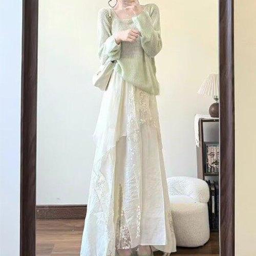 [아리엘스타일]여리핏니트 레이스롱스커트 꽃놀이룩 그린레아투피스
