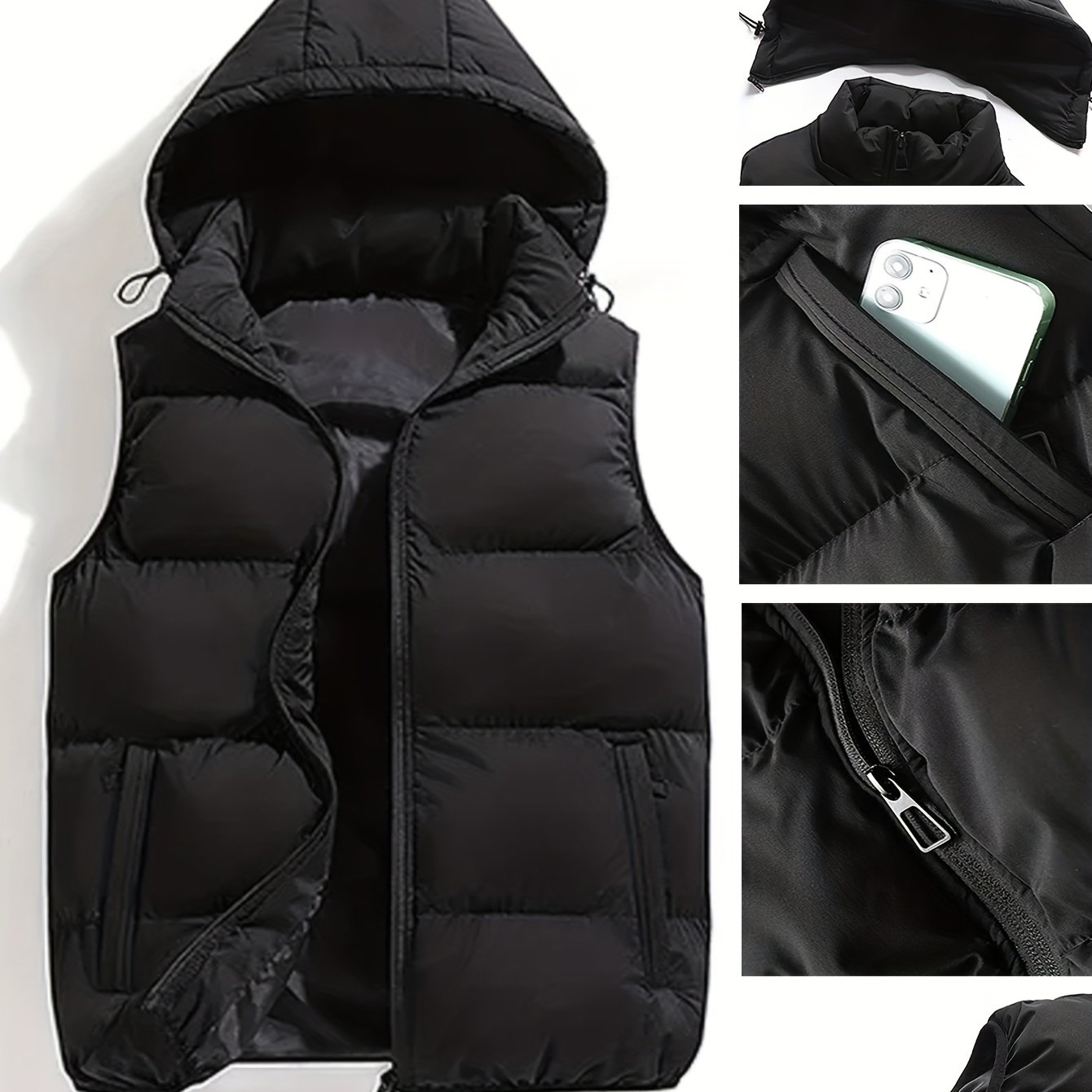 TEMU 가을, 겨울용 두꺼운 분리형 후드 조끼, 따뜻하고, 스탠드 칼라, 캐주얼 민소매 디자인, 지퍼 포켓 특징
