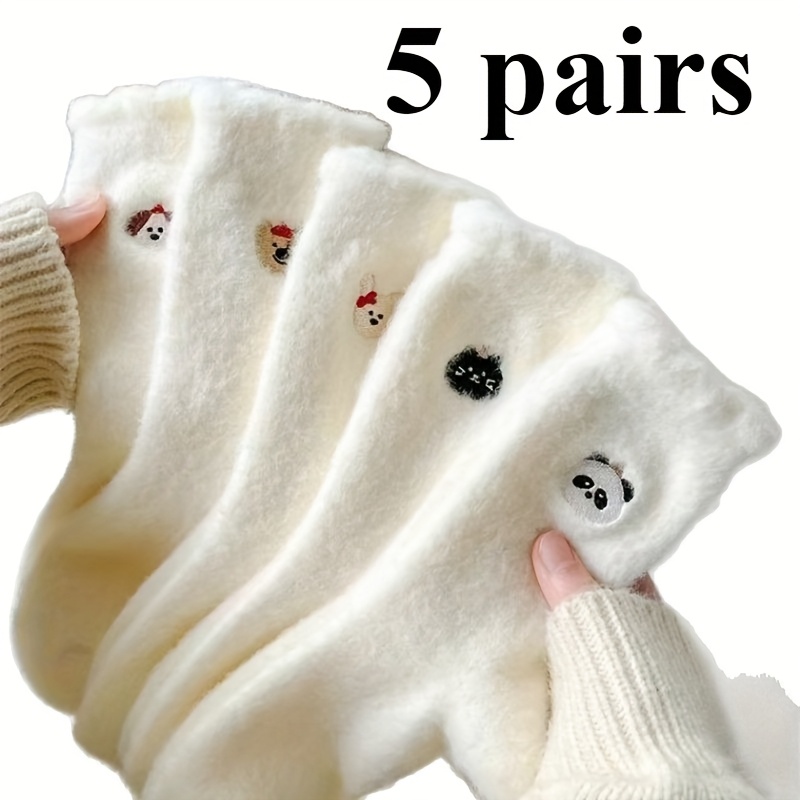 TEMU 10개/5켤레 따뜻하고 편안한 바닥 양말, 크림 화이트 캐릭터 자수, 여성용 미드 캐프 안감 슬리퍼, 신발 양말, 포근한 슬리퍼,겨울의 따뜻함,장난스러운 패턴,스타일리시 양말,부드러운 원단,슬리퍼 양말,아늑한 신발,그녀를 위한 선물