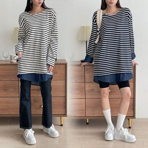 파파야 DP01 단가라 카라넥 맨투맨 티 배색 단가라 루즈핏티,스트라이프