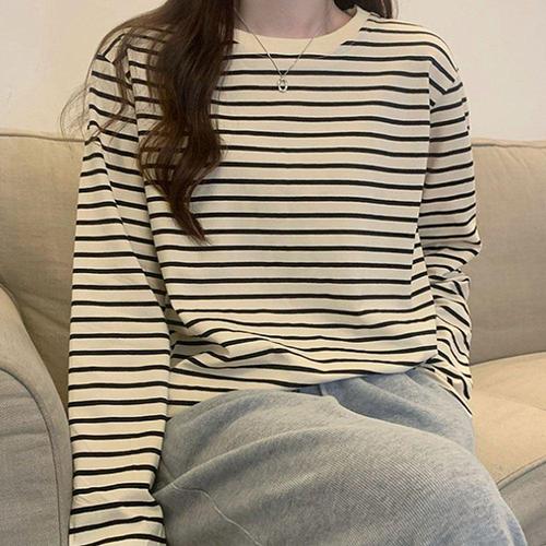 여성 루즈핏 스트라이프 긴팔티 데일리룩 티셔츠 WFKORQO