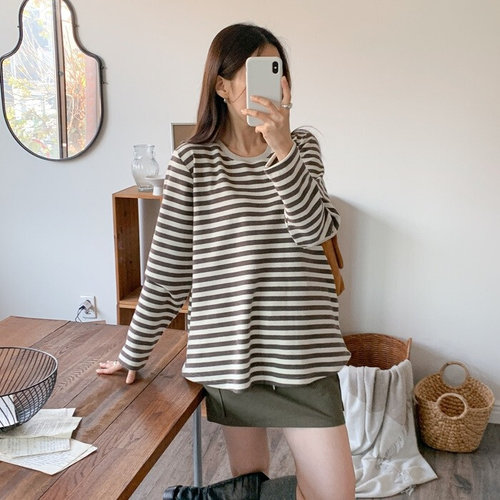 [옷자락] 여성 캐주얼 면스판 스트라이프 라운드 긴팔티