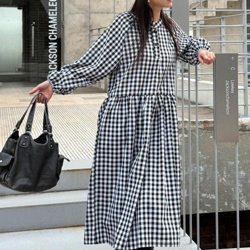 [옷자락] 여성 깅엄체크 체크무늬 버튼 빅사이즈 봄철 코튼 롱드레스