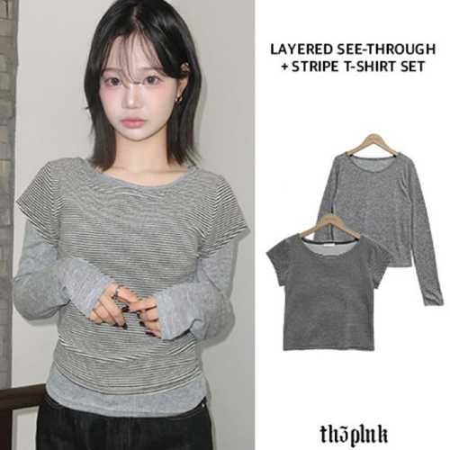 더핑크 / 예닌 레이어드 시스루 긴팔티 스트라이프 반팔티 set