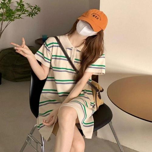 단정하고 편한 카라 반팔 잔스트라이프 미니원피스 WFIZKLB