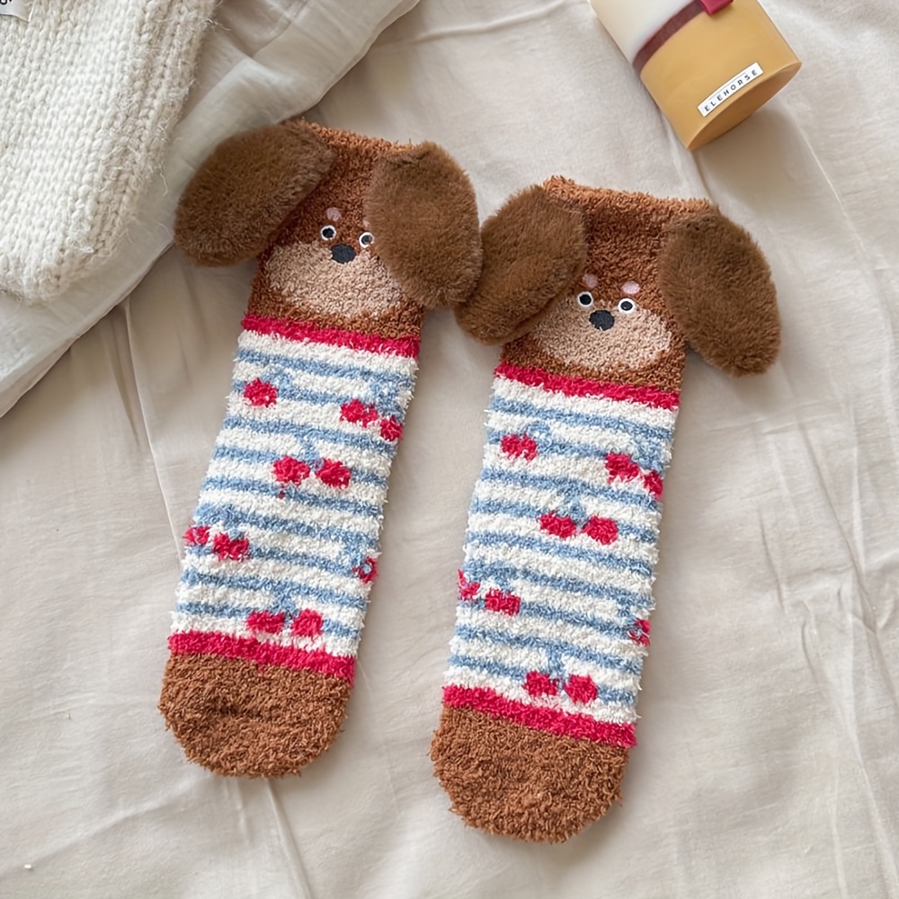 TEMU 새 여성용 만화 소시지 강아지 산호 양털 자수 크리스마스 미드 카프 양말, 여성용 홈 플로어 양말, 털 빠짐 없는 잠옷 양말