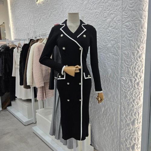 [샤틴]더블버튼 배색 골지 니트원피스 (S231P912)_DG