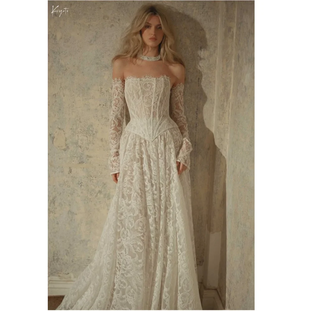 교토 맞춤형 베이지 플로럴 레이스 A라인 웨딩드레스 정교한 탈부착 가능한 소매 웨딩드레스 스윕 트레인 포멀 2025
