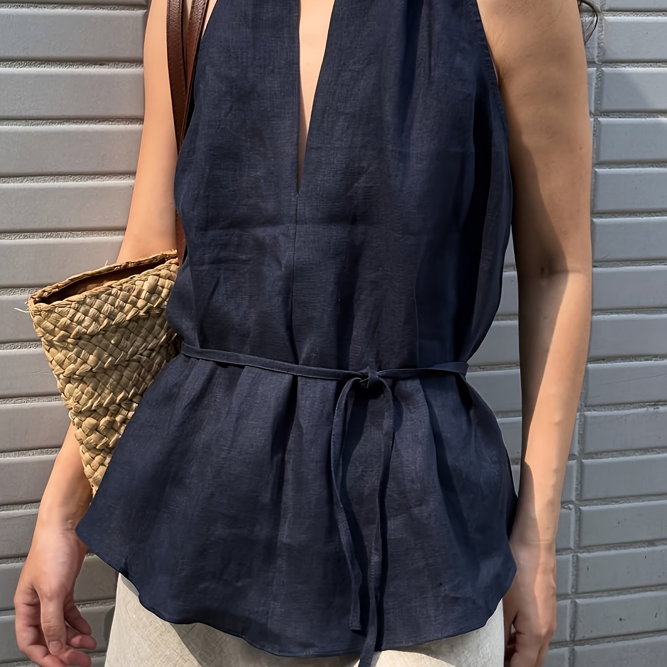 TEMU V넥 타이 디자인의 세련된 민소매 탑. 캐주얼 외출, 스타일리시한 출퇴근, 데이트, 휴가, 오피스룩에 완벽합니다.