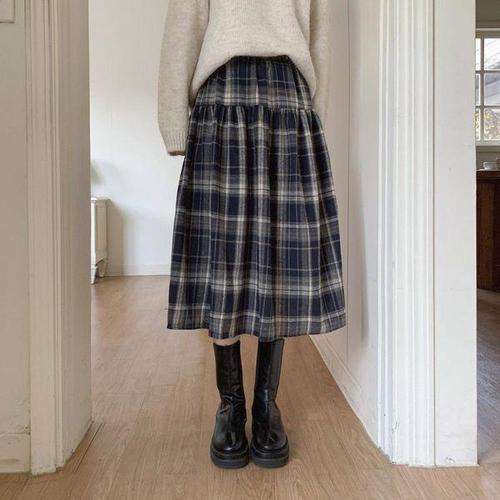 여성용 캐주얼 체크롱 맥시스커트 데일리룩