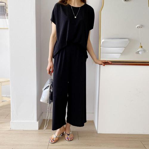 여성데일리룩 봄신상 군살커버 블랙 투피스 티셔츠+팬츠 세트