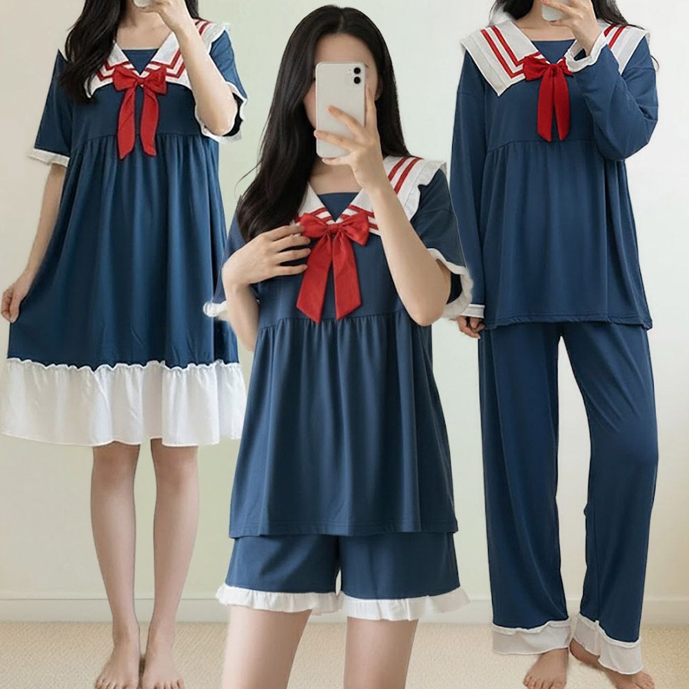 도로시 리본 카라 세일러 프릴 홈웨어 반팔 잠옷 세트 파자마 상하 원피스
