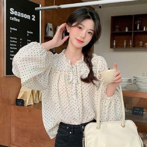 [에이치플러스몰]여성 봄 도트 퍼프 쉬폰 긴팔 프릴 블라우스