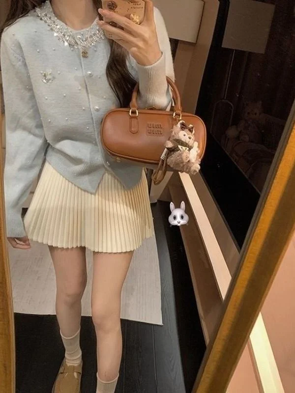 진주 칼라 니트 오픈 가디건 스커트 세트 여성용 부드럽고 아늑한 가을 겨울 패션 투피스 수트 프렌치 스타일 캐주얼 웨어
