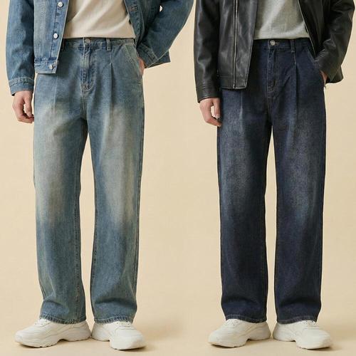 [디바옴므]핀턱 뒷밴딩 워싱 와이드 청바지 빈티지 데님 팬츠 남성 남자
