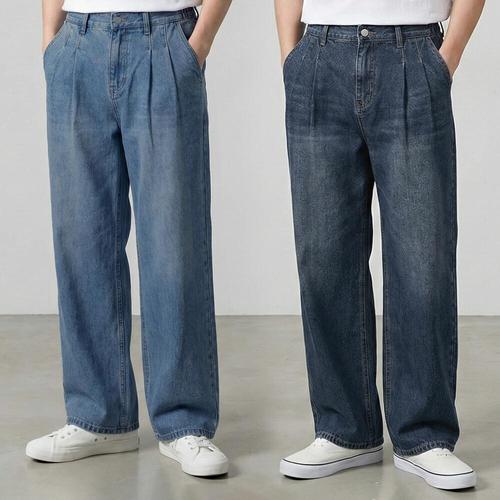 [디바옴므]투라인 핀턱 뒷밴딩 워싱 와이드 청바지 데님팬츠 빈티지 테이퍼드 세미 남성 남자