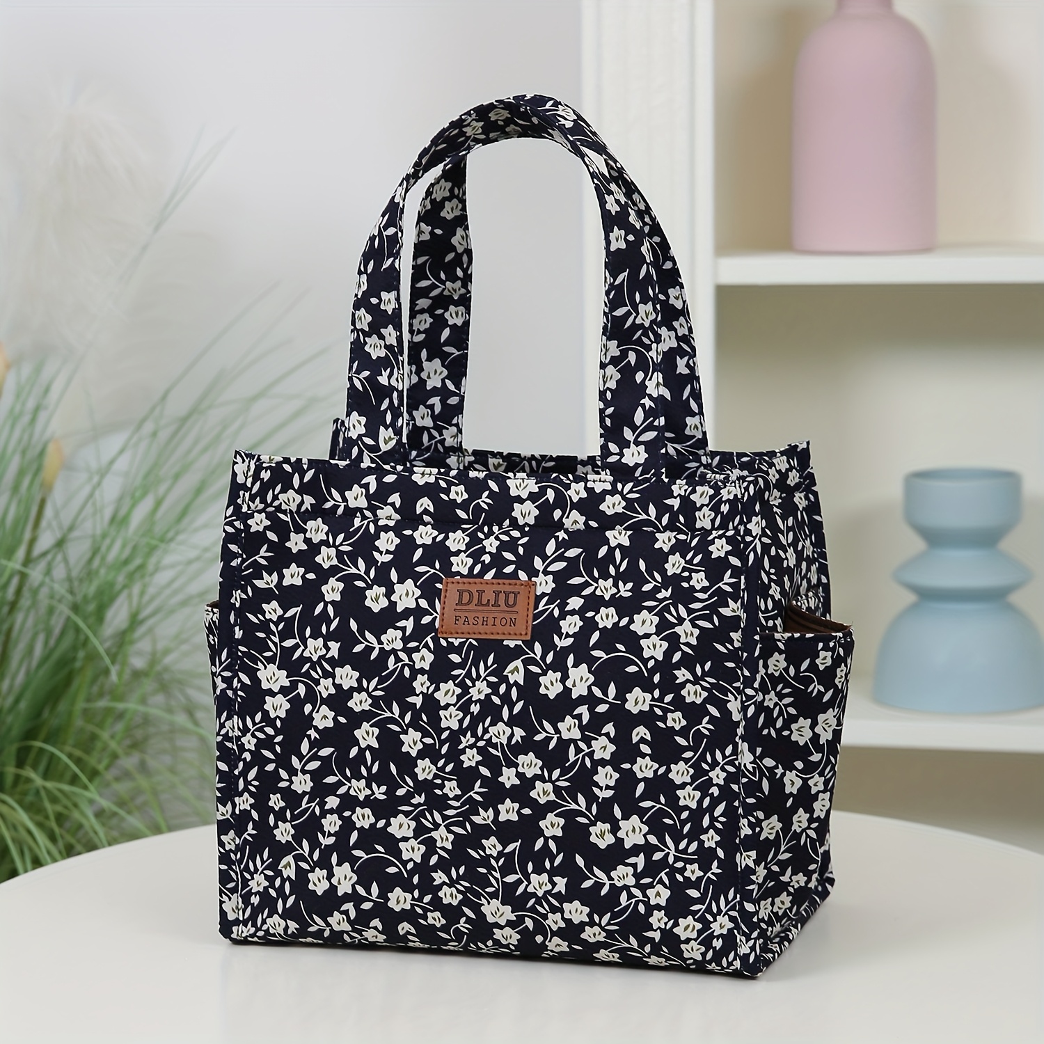 TEMU 신제품, 두꺼운 프린트 원단, 플로럴 패턴, 토트백, 대용량 휴대용 도시락 보관 가방, 지퍼 잠금 디자인, 직장 출퇴근 식사, 쇼핑 외출, 일상 사용, 잡화 보관에 적합