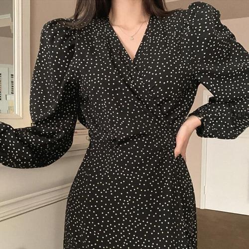 [페이릿] 키바 도트 패턴 랩스타일 브이넥 롱 원피스