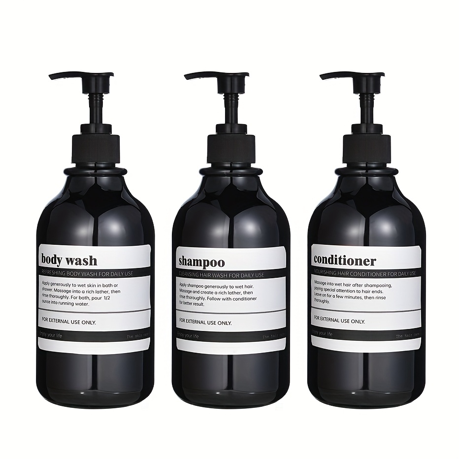 TEMU 3pcs 우아한 블랙 앤 화이트 플라스틱 욕실 디스펜서 세트 - 샴푸, 컨디셔너, 바디 로션, 바닥에 서서, 전기 없이, 쉽게 식별할 수 있는 라벨이 달려 있습니다, 욕실용
