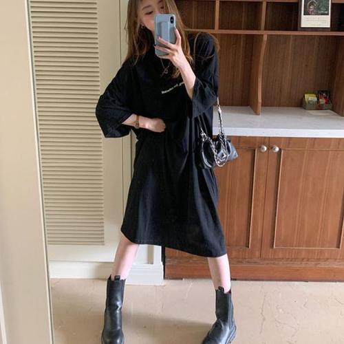 [미라클세븐]여성 루즈핏 반팔 롱원피스 옆트임 체형 보정 라운드넥