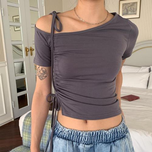 여자 라운드넥 원숄더 스트랩 사이드 셔링 슬림핏 반팔티