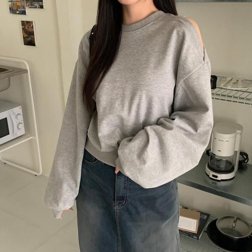 [옷자락]여자 라운드넥 원숄더 트임 무지 크롭 맨투맨