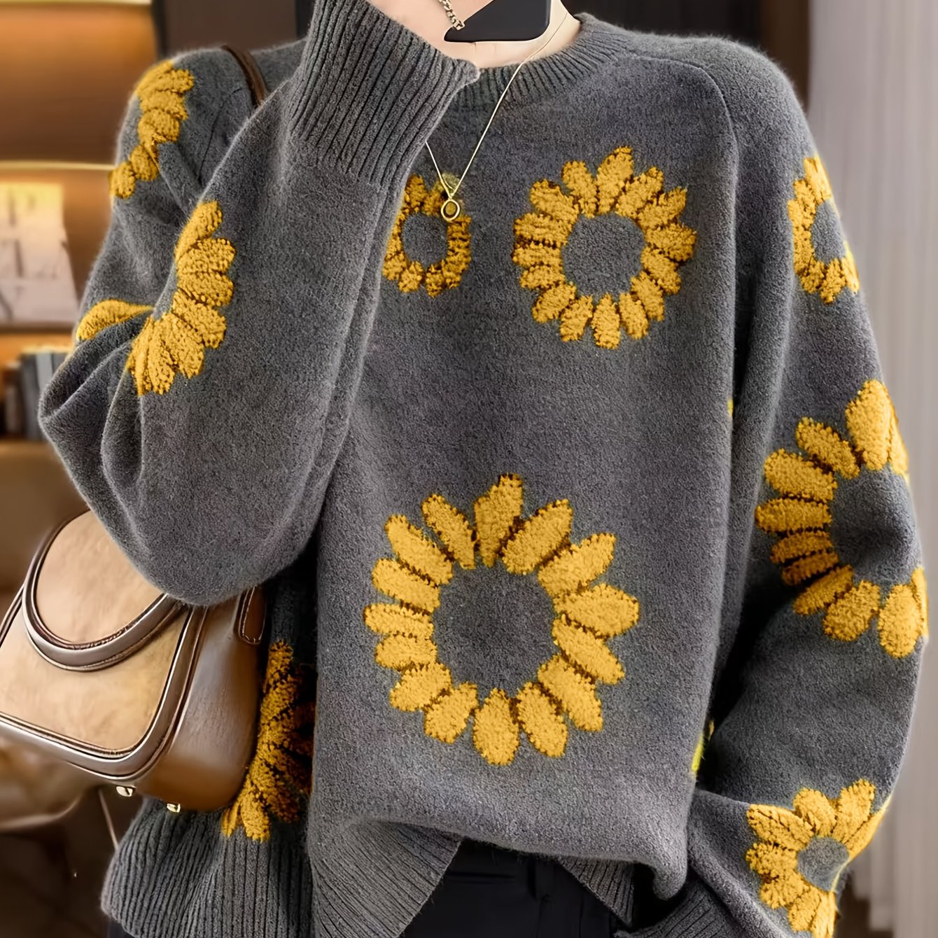 TEMU 세련된 플로럴 디자인의 여성용 시크 라운드넥 울 스웨터 - 카본 그레이 배경에 노란색 자수 장식. 이 캐주얼하고 넉넉한 핏의 풀오버는 부드럽고 편안한 울로 제작되었으며 긴 소매가 있습니다.