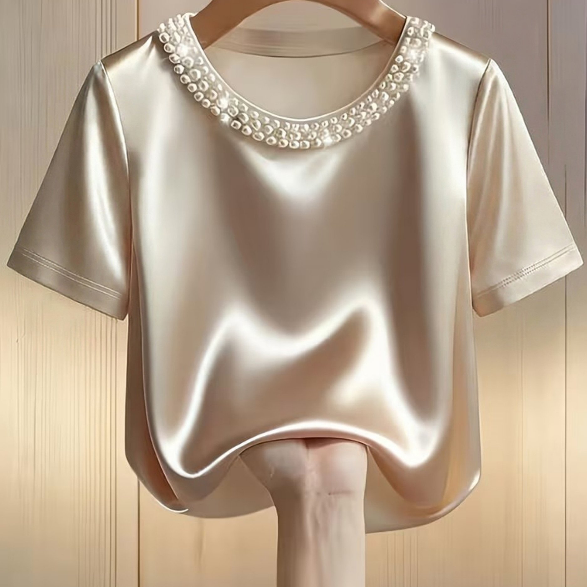 TEMU 진주 장식이 있는 우아한 새틴 라운드넥 반팔 블라우스
