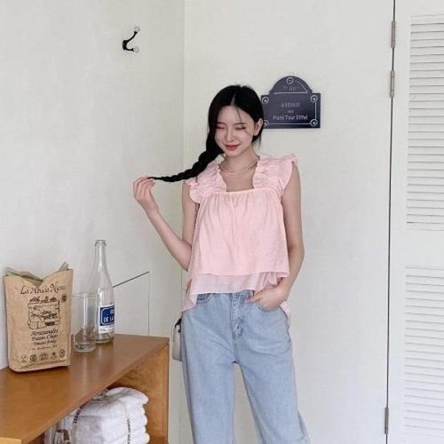 [다잇템][다잇템] 여성 티어드 귀여운 슬리브리스 프릴 부드러운 스퀘어넥 블라우스_23328492_588872