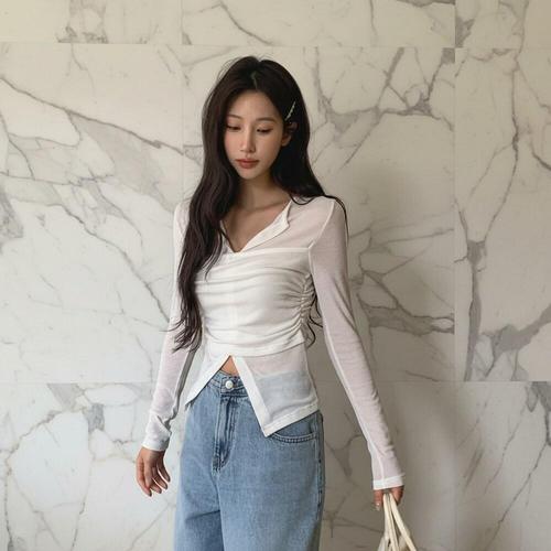 [미라클세븐]여성용 봄가을 시스루 랩 스타일 긴팔 티셔츠
