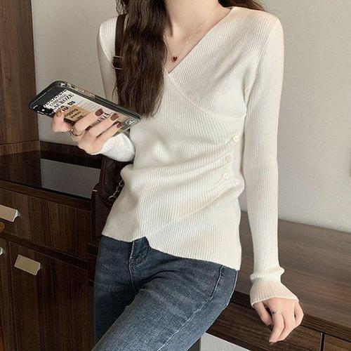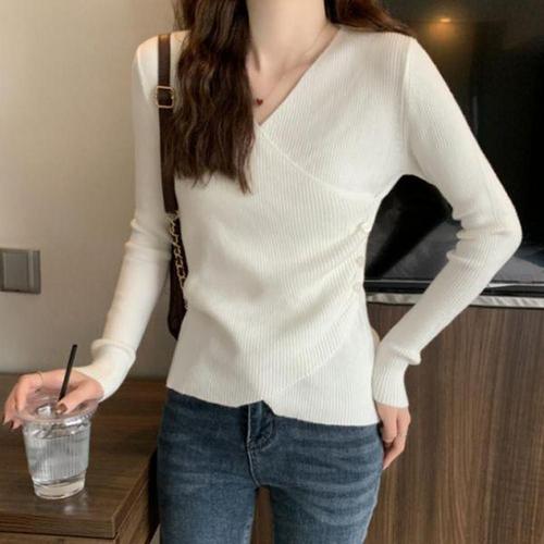 [에이치플러스몰]여성 슬림핏 크로스 브이넥 랩 골지 긴팔 니트 티셔츠