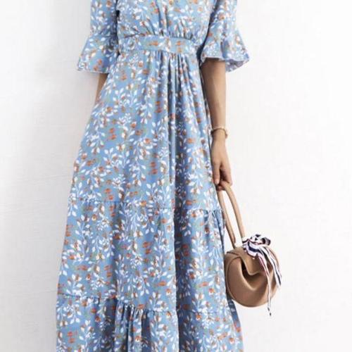 여성 브이넥 쉬폰 미니 원피스 여성 플로랄 러플 미니 드레스 슬림 허리 비대칭 롱 리본 원피스 여신룩 LT